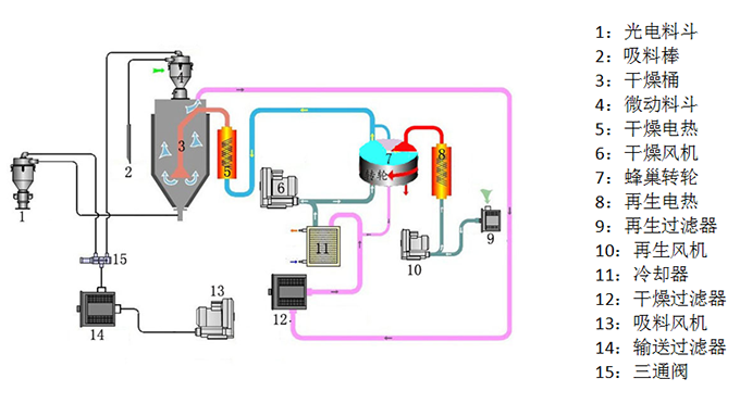–、干燥除濕部分:從干燥料桶回來的濕熱空氣經(jīng)冷卻,吹入蜂巢轉(zhuǎn)輪.空氣中的水分被轉(zhuǎn)輪吸附,然后又被再生加熱空氣所脫附.兩股氣流同時(shí)作用在轉(zhuǎn)輪上,并隨著轉(zhuǎn)輪的轉(zhuǎn)動(dòng),使得空氣中的水分連續(xù)不斷的被吸附又被再生空氣所脫附而排出,就形成穩(wěn)定的低露點(diǎn)空氣,經(jīng)加熱到塑膠的干燥溫度,吹入干燥料桶內(nèi),形成密循環(huán),干燥原料.